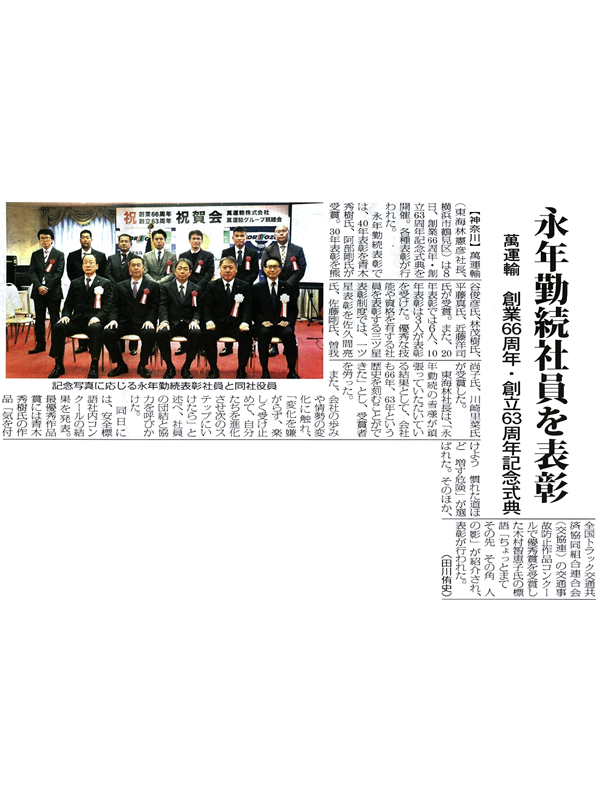 2019年11月22日 物流ニッポン「萬運輸 経営計画など理解促進 創業60周年 永年勤続者など表彰」