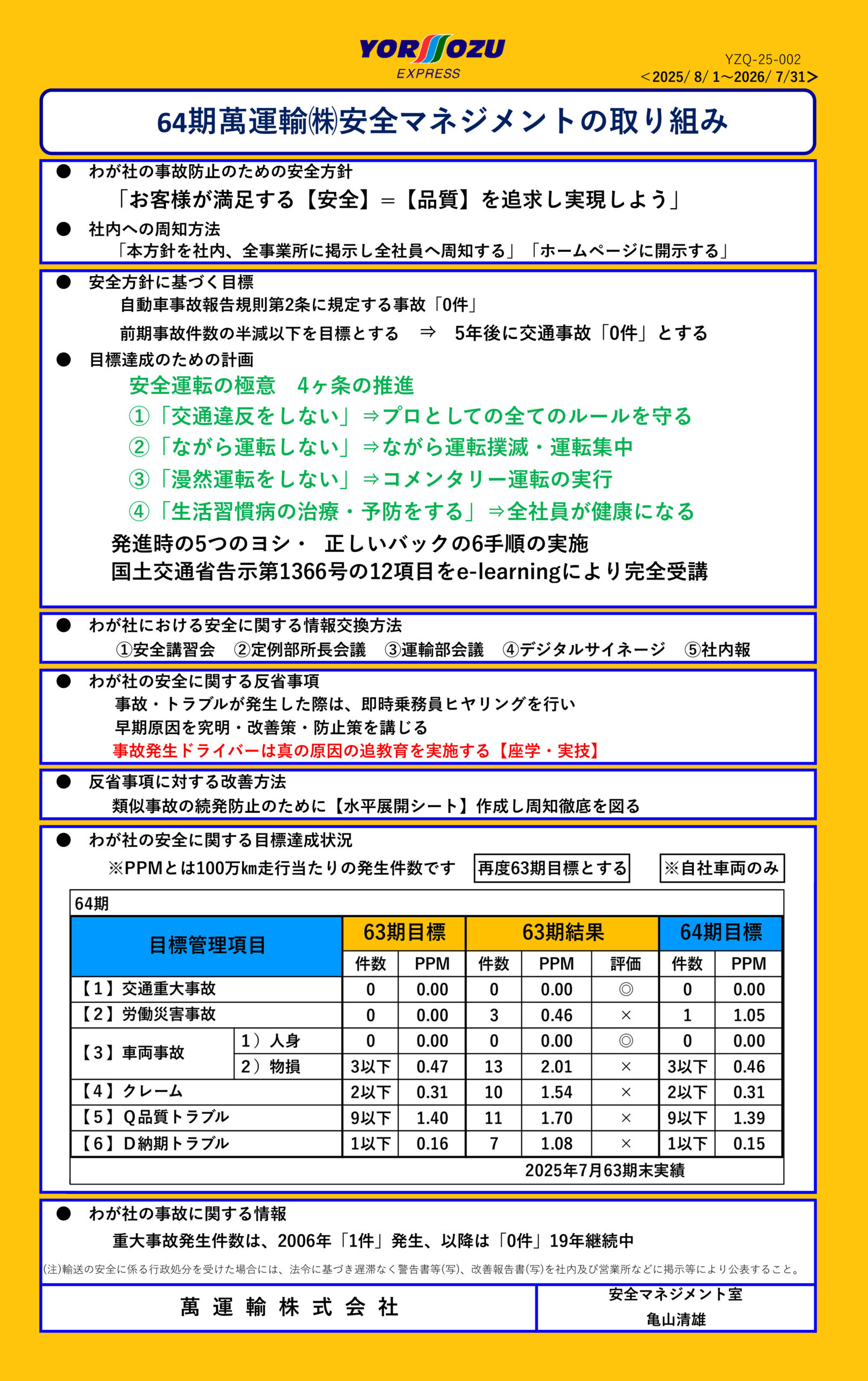 『お客様が満足する「安全」=「品質」を追求し実現しよう』という 安全方針のもと、交通重大事故0件を目標に全社一丸となって活動をしています。